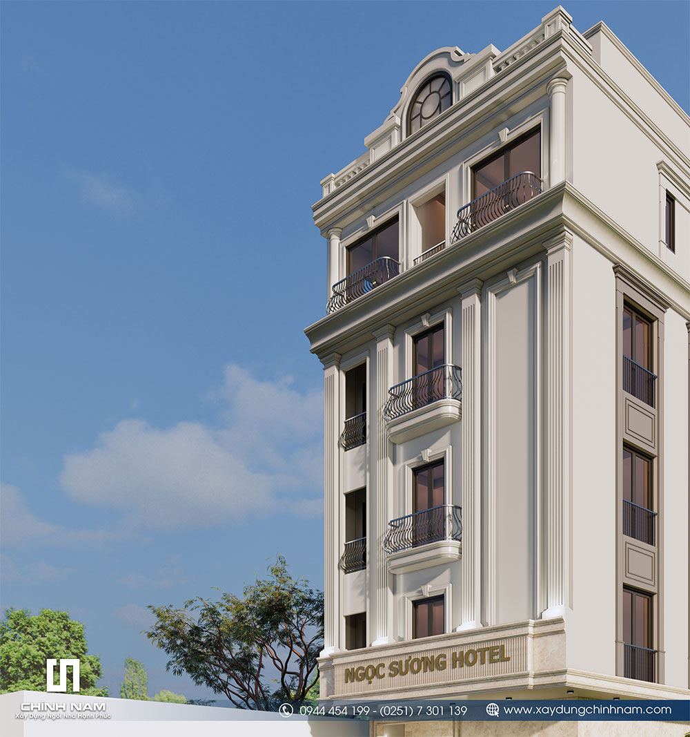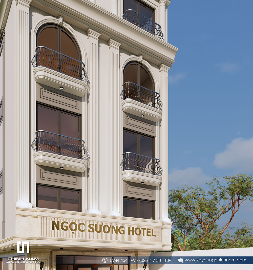 Các chi tiết phào chỉ được tiết chế tinh tế nhằm giữ được vẻ đẹp cổ điển nhưng vẫn đảm bảo tính hiện đại trong tổng thể thiết kế. Hệ ban công uốn cong kết hợp cùng các ô cửa kính lớn giúp công trình trở nên thanh thoát, đồng thời tối ưu khả năng đón sáng và thông gió tự nhiên cho các phòng lưu trú. Gam màu trắng kem chủ đạo không chỉ mang đến cảm giác trang nhã mà còn góp phần làm nổi bật kiến trúc mặt tiền, giúp khách sạn tạo ấn tượng mạnh mẽ ngay từ góc nhìn đầu tiên.