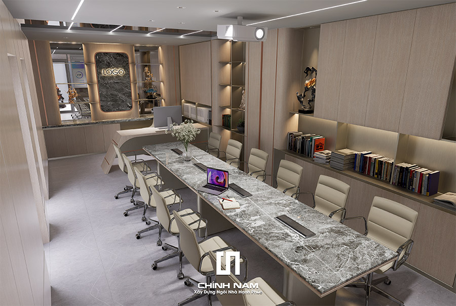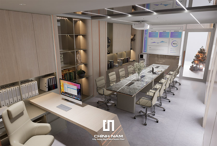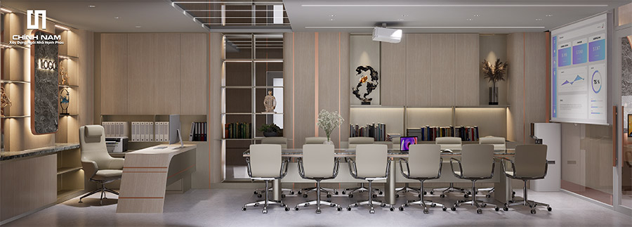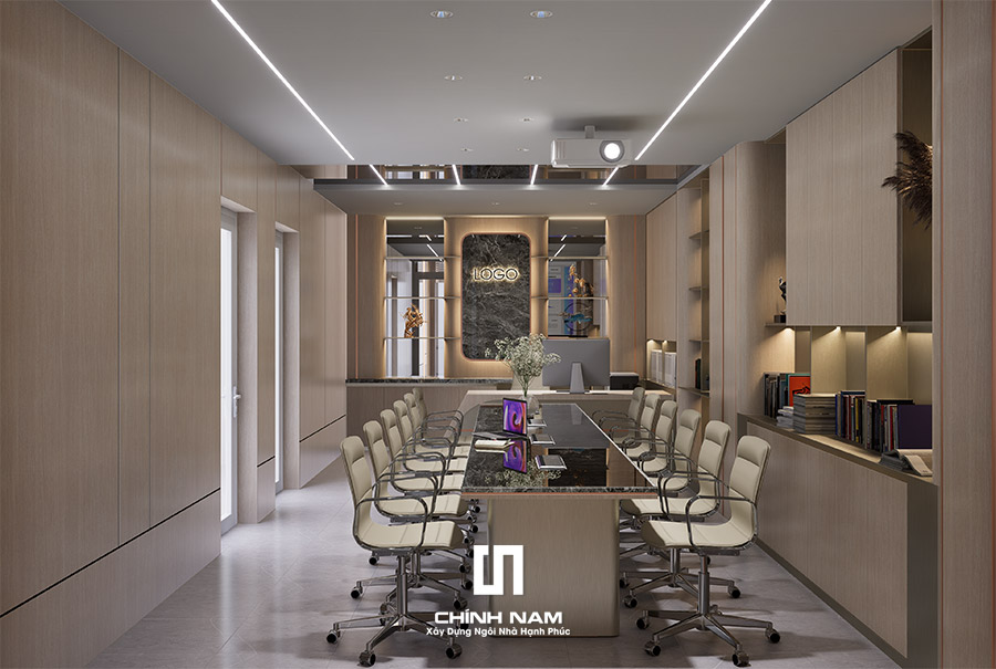 Phòng họp được thiết kế rộng rãi, kết hợp bảng điện tử trình chiếu, ánh sáng âm trần và hệ tủ lưu trữ đồng bộ, mang đến hình ảnh chuyên nghiệp cho doanh nghiệp.