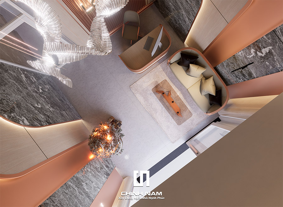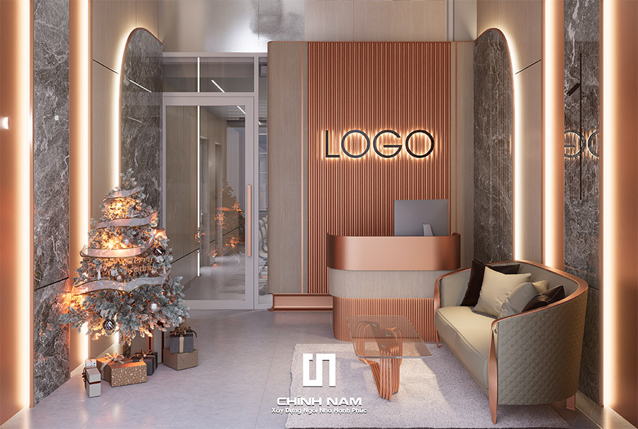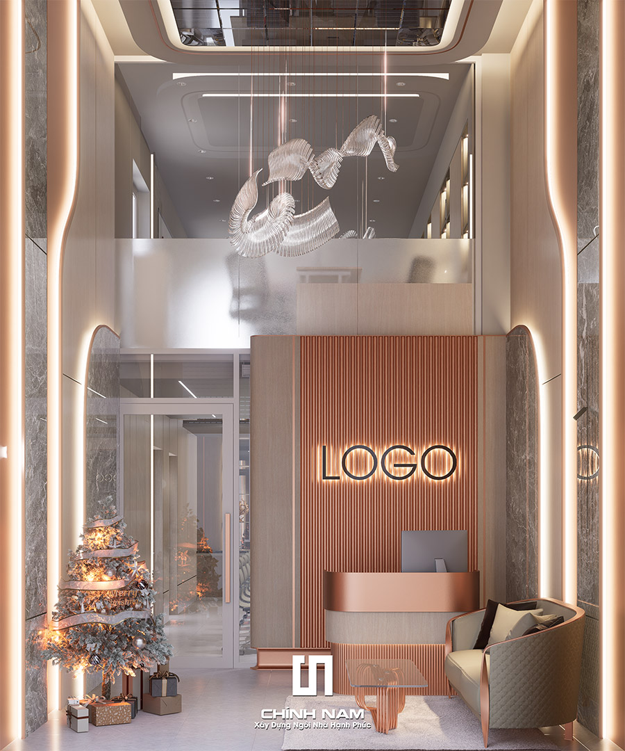 Lấy cảm hứng từ phong cách Modern Luxury, NK’s Office sử dụng các đường cong mềm mại kết hợp cùng vật liệu cao cấp như gỗ veneer, đá marble, ánh kim. Hệ thống đèn trang trí nghệ thuật tạo chiều sâu và cảm giác sang trọng cho không gian. Đặc biệt, khu lễ tân với mảng tường logo nổi bật là điểm nhấn nhận diện thương hiệu – thể hiện sự chuyên nghiệp và đẳng cấp của doanh nghiệp ngay từ bước chân đầu tiên.