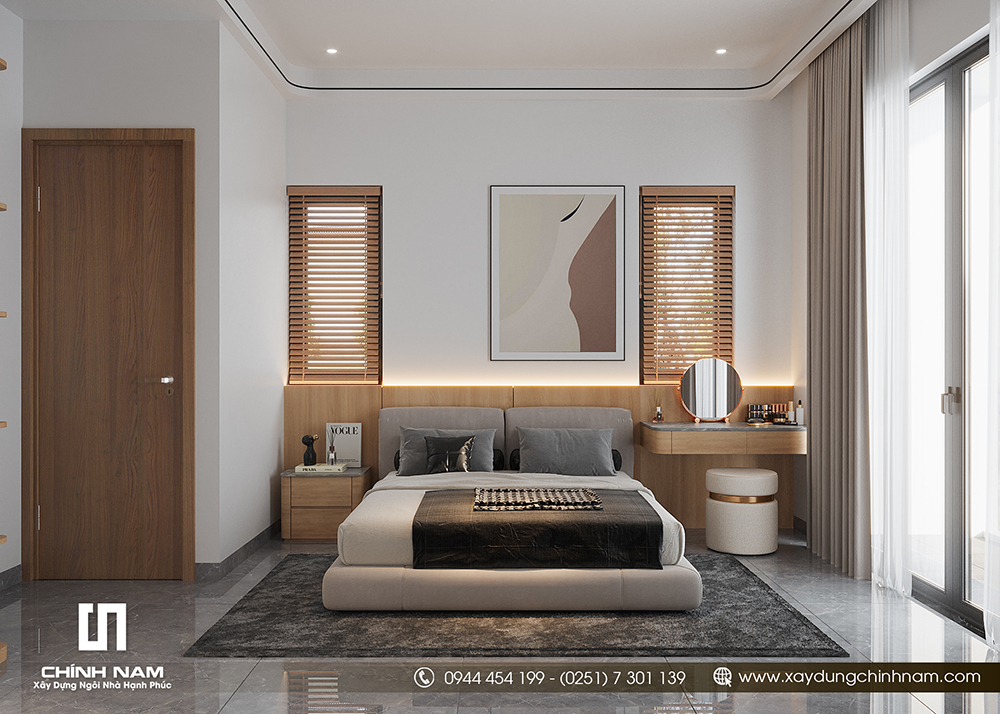 Phòng ngủ master đi theo tinh thần “ít nhưng tinh”. Giường bọc tông trung tính, kết hợp tap đầu giường gỗ. Mảng đầu giường chạy dài cùng đèn hắt tạo cảm giác êm, thư giãn. Bố trí bàn trang điểm và gương tròn gọn gàng, tiện dụng, không phá vỡ tổng thể tối giản. Cửa kính lớn + rèm giúp đón sáng tốt, hỗ trợ thông thoáng và cân bằng nhịp sinh hoạt.