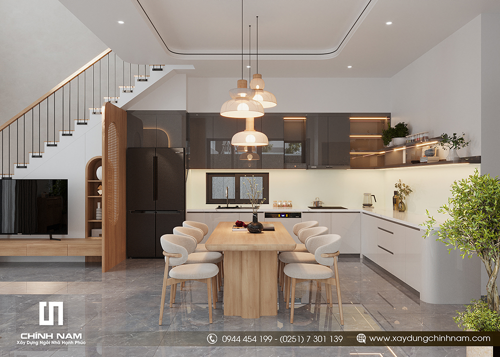 Điểm mạnh của Gió Hous nằm ở bố cục không gian liên thông: phòng khách kết nối bàn ăn và bếp, tạo sự liền mạch, gia tăng tương tác gia đình. Hệ tủ bếp hiện đại, phối màu sáng – xám đậm tạo tương phản vừa đủ. Dải đèn hắt dưới tủ bếp giúp bếp luôn sáng và “sạch” về thị giác. Cụm đèn thả bàn ăn thiết kế mềm mại, ánh sáng vàng dịu, tạo mood ấm cúng cho những bữa cơm nhà. Một chi tiết đáng chú ý là vách/khung gỗ kết hợp mây đan vừa đóng vai trò phân tách ước lệ, vừa là điểm nhấn thẩm mỹ, giúp không gian có “chất” riêng mà không nặng nề.