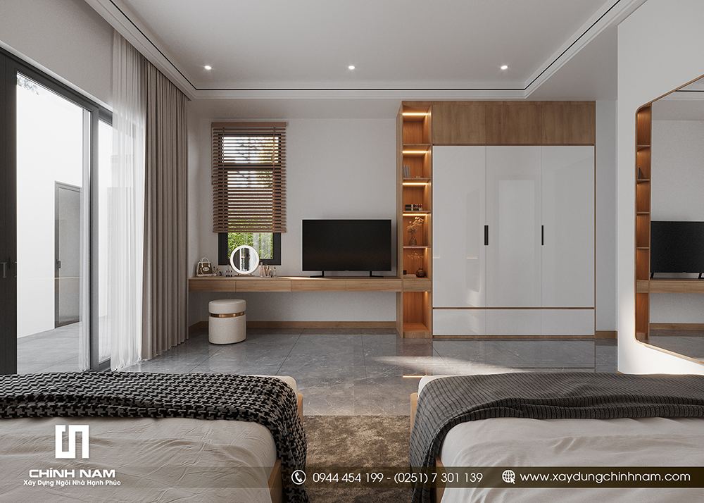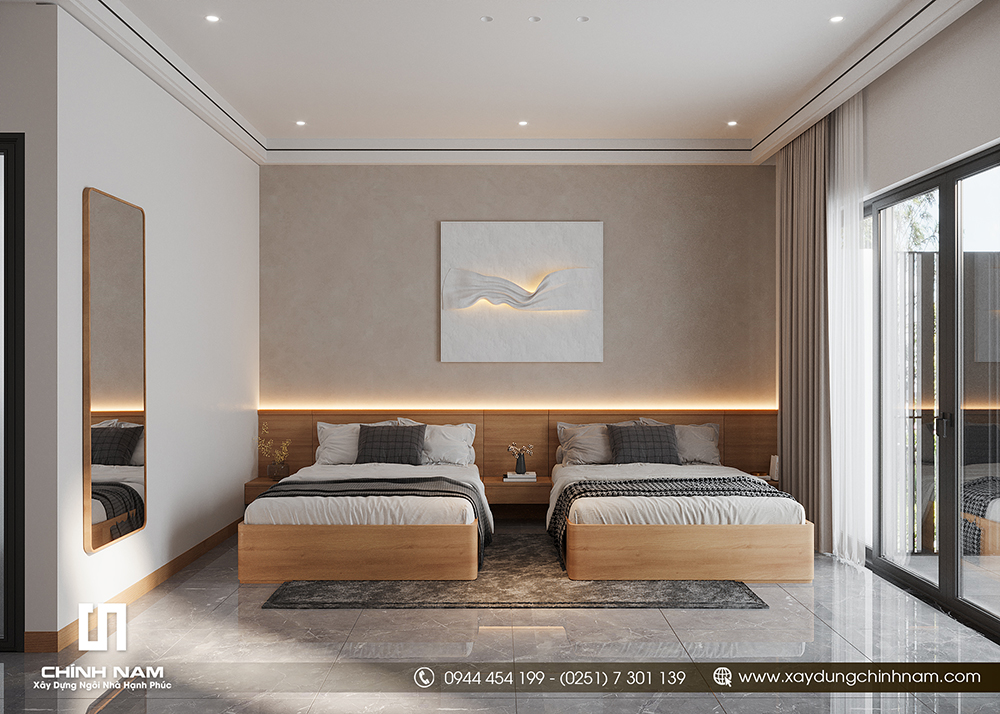 Không gian phòng ngủ 2 giường đồng bộ ngôn ngữ vật liệu: gỗ – trung tính – ánh sáng hắt. Hai giường đặt cân đối, mảng đầu giường chạy dài tạo cảm giác rộng hơn, phù hợp cho gia đình có trẻ nhỏ hoặc phòng ngủ dành cho khách.