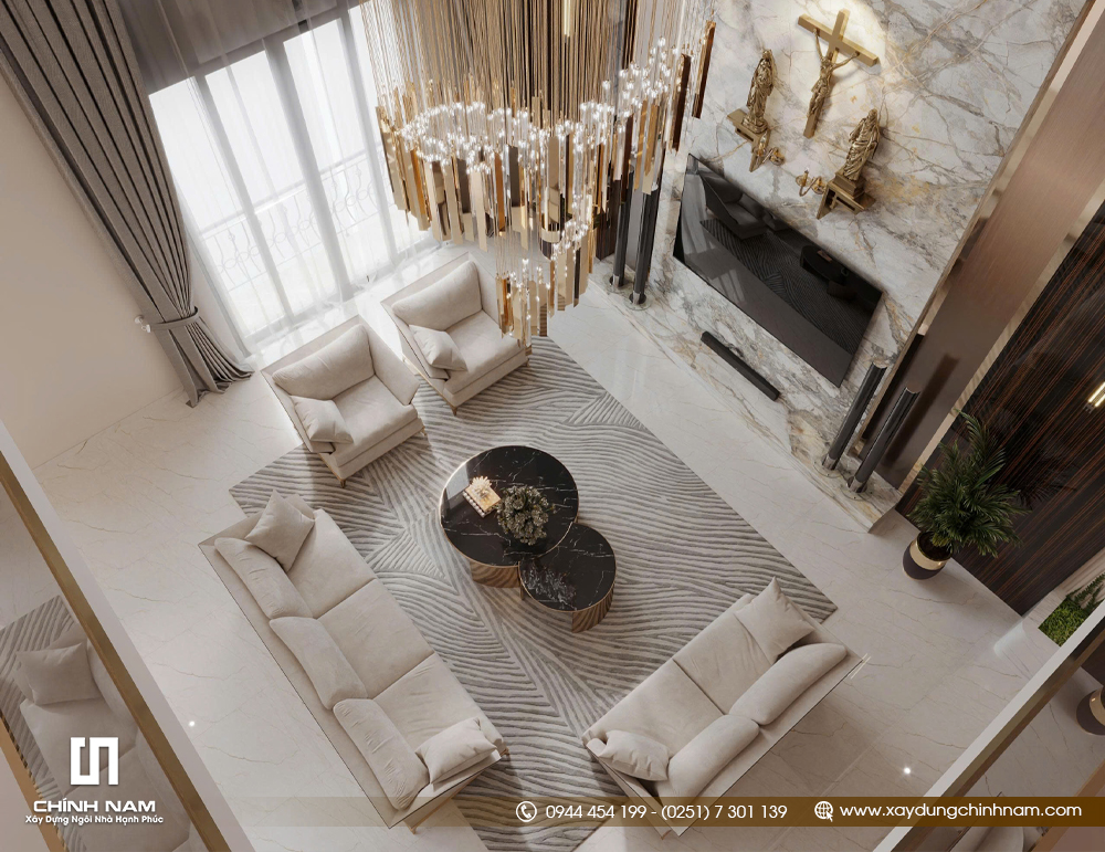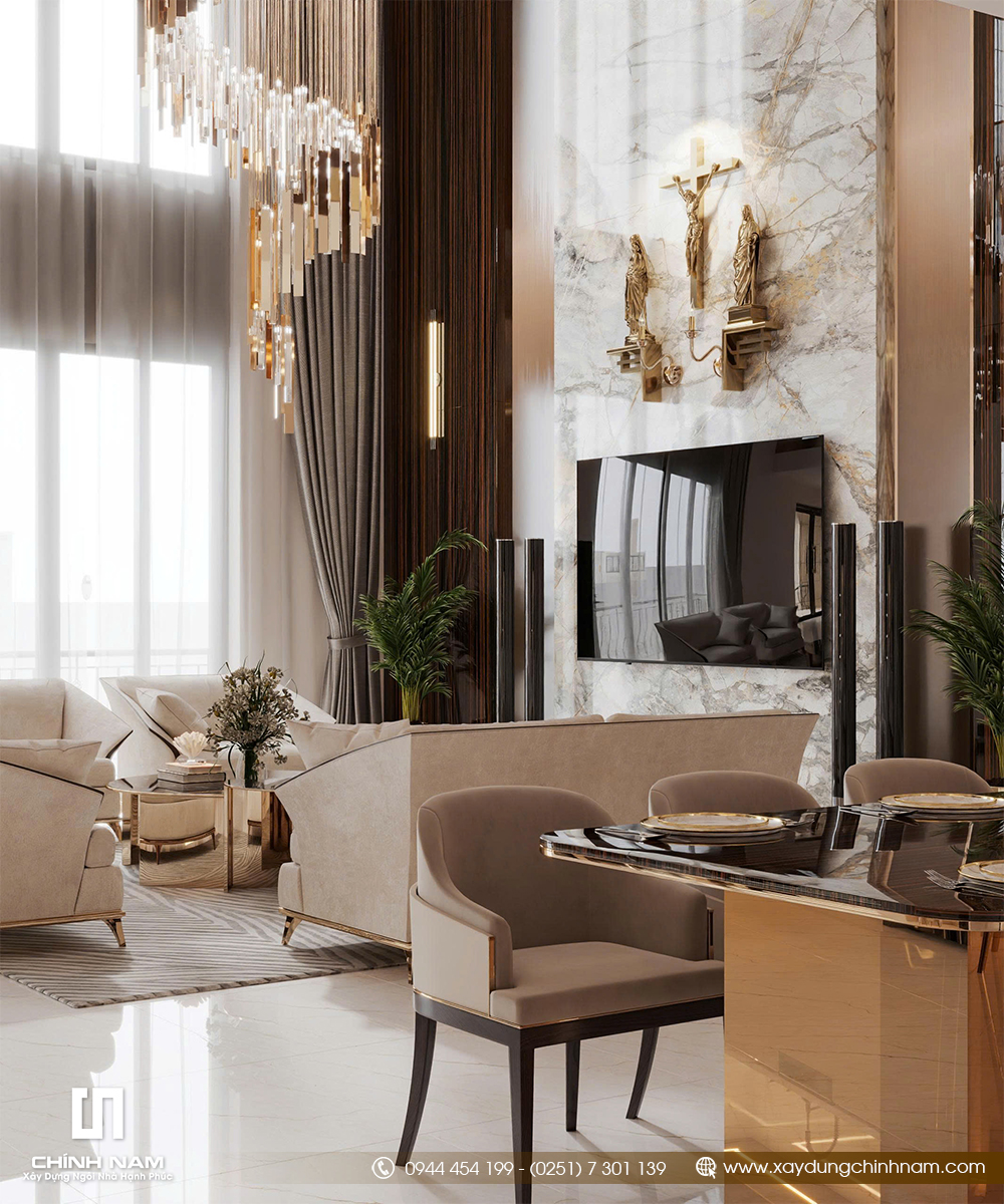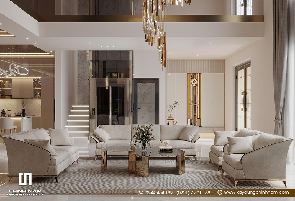 Điểm nhấn nổi bật của công trình là khu vực phòng khách thông tầng với chiều cao ấn tượng, mở rộng tối đa cảm giác bề thế và thoáng đãng. Bộ sofa tông sáng, bàn trà hiện đại, thảm trải sàn mềm mại cùng cụm đèn chùm nghệ thuật tạo nên một tổng thể tiếp khách sang trọng nhưng vẫn hài hòa. Không gian được xử lý cân đối, mang đến hiệu ứng thị giác mạnh mẽ ngay từ ánh nhìn đầu tiên..jpg)