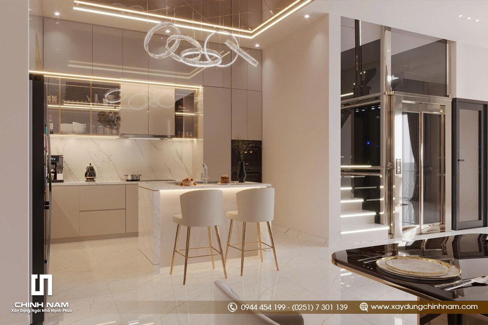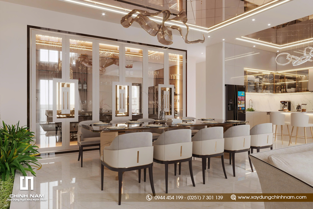 Khu vực bàn ăn và bếp tiếp nối mạch thẩm mỹ chung bằng phong cách hiện đại, gọn gàng nhưng đậm chất cao cấp. Bộ bàn ăn dài, ghế bọc nệm thanh lịch, hệ tủ trưng bày và đảo bếp trung tâm giúp không gian vừa tiện nghi trong sử dụng, vừa tạo cảm giác đẳng cấp trong từng trải nghiệm sinh hoạt hằng ngày. Đây là cách tổ chức không gian phù hợp với những gia chủ đề cao sự chỉn chu và chất lượng sống.