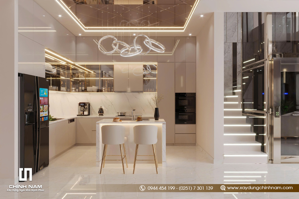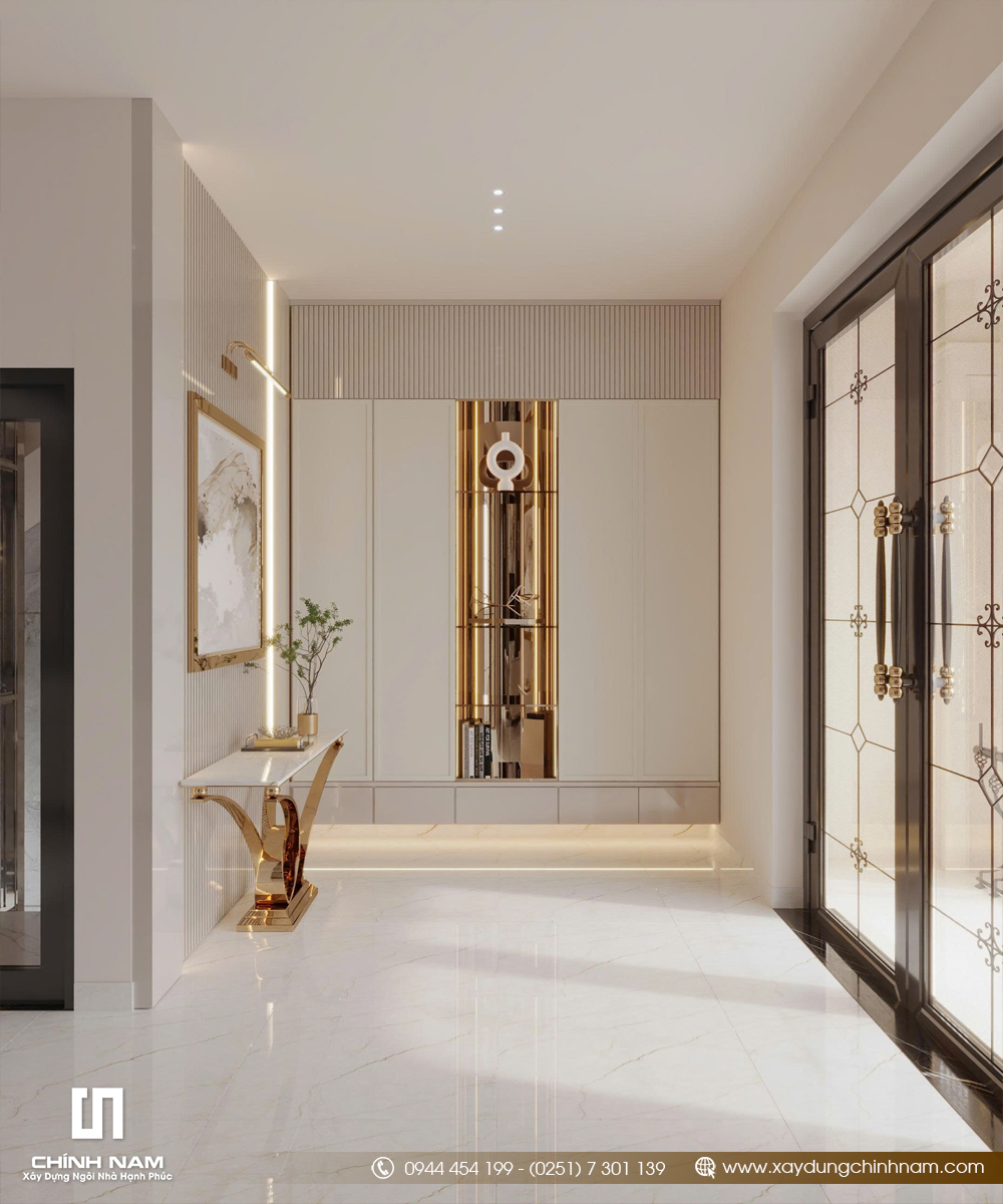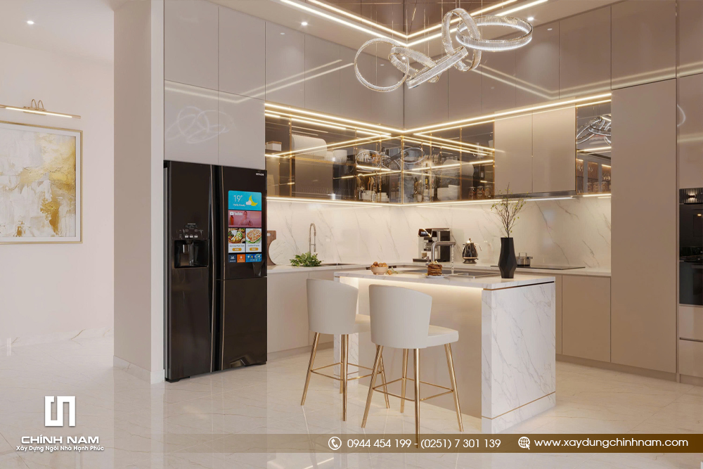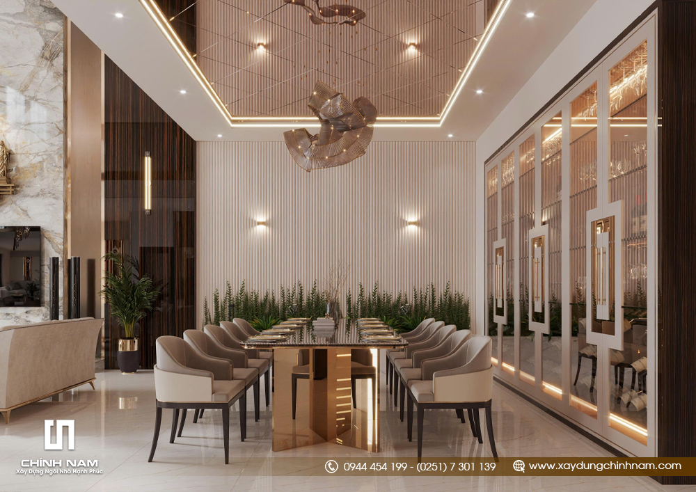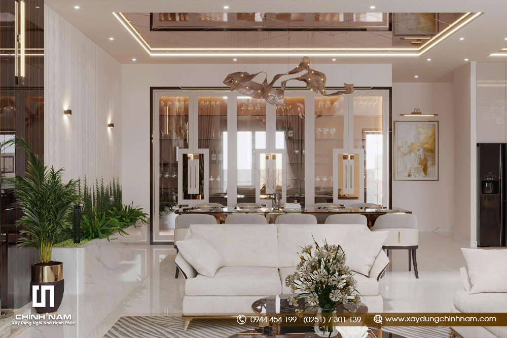 Bên cạnh bố cục đẹp, Golden Classic Villa còn ghi dấu ấn nhờ khả năng phối hợp vật liệu tinh tế. Đá vân lớn, kim loại ánh vàng, gỗ tối màu, kính và các bề mặt bóng sáng được kết hợp đồng bộ, tạo nên vẻ đẹp luxury rõ nét. Bảng màu trung tính gồm kem, be, trắng ngà và nâu trầm giúp toàn bộ nội thất vừa sang trọng, vừa ấm áp và bền giá trị theo thời gian.
