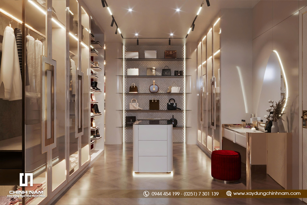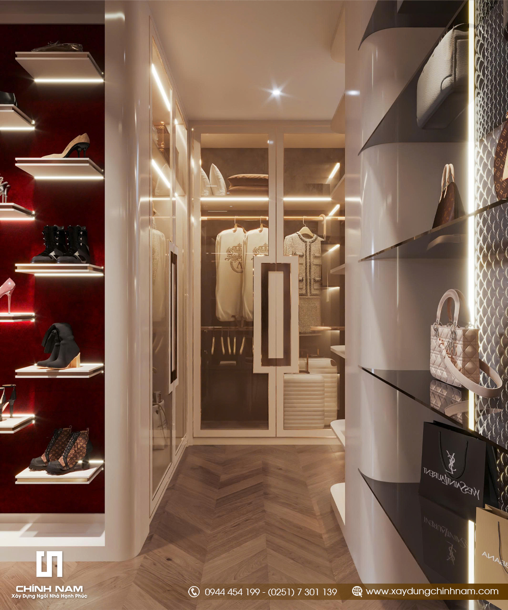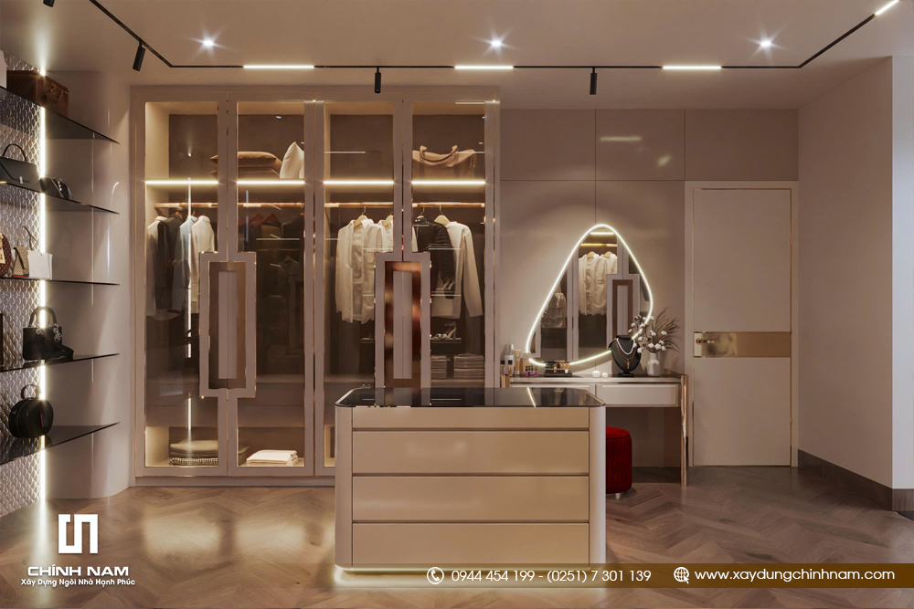 Ở khu vực riêng tư, phòng ngủ master được thiết kế theo hướng ấm áp, thư giãn nhưng vẫn giữ trọn khí chất sang trọng. Mảng đầu giường, hệ tủ, ánh sáng dịu và bố cục nội thất đều được xử lý đồng bộ, mang lại cảm giác nghỉ ngơi cao cấp. Đặc biệt, phòng thay đồ được đầu tư như một không gian trưng bày cá nhân, với hệ tủ kính, bàn trang điểm và ánh sáng led tinh tế, thể hiện rõ phong cách sống của gia chủ.