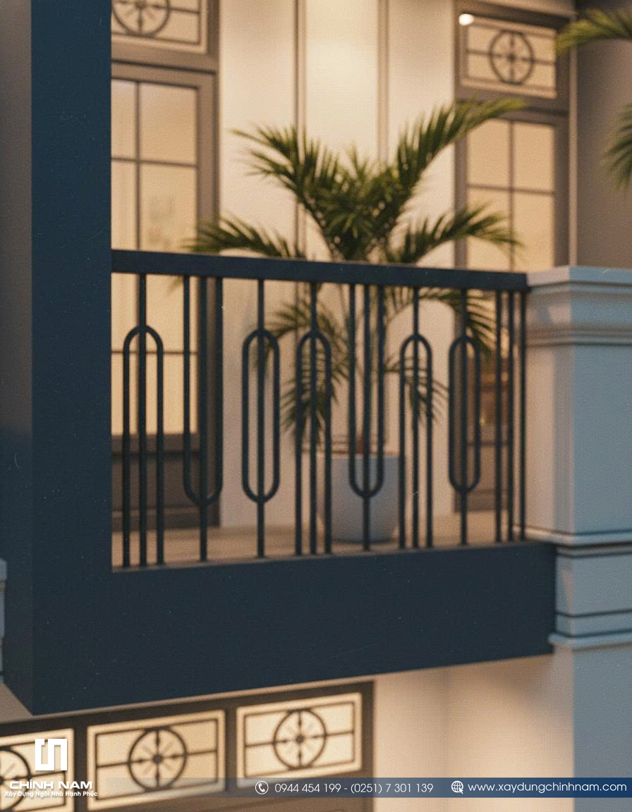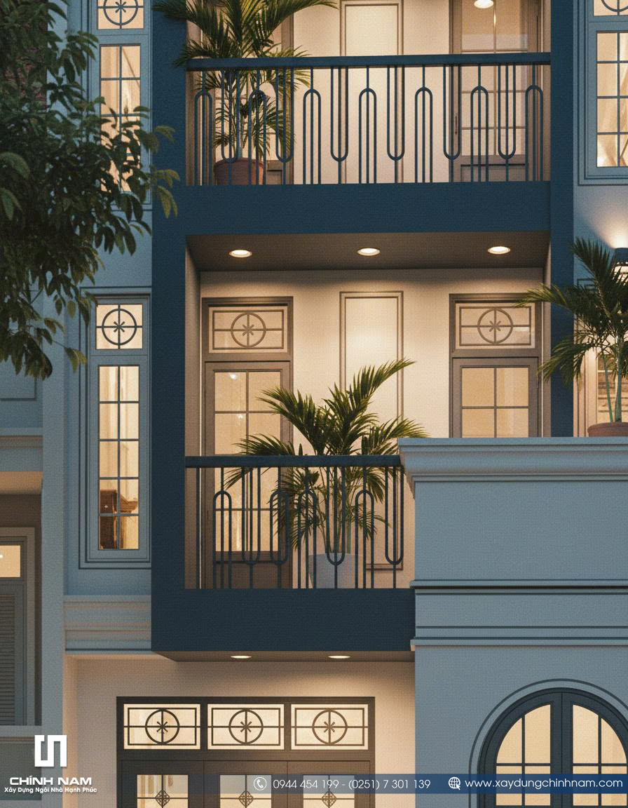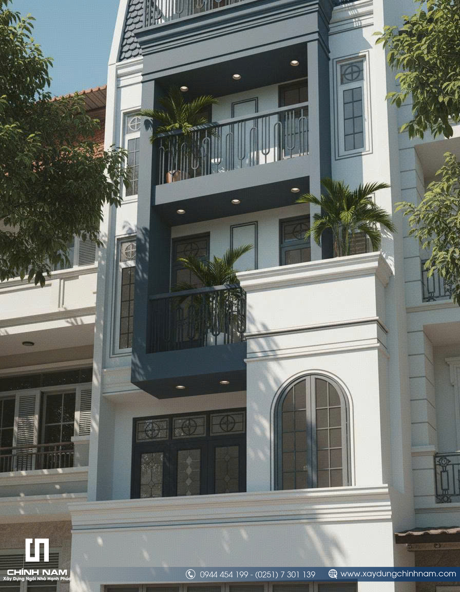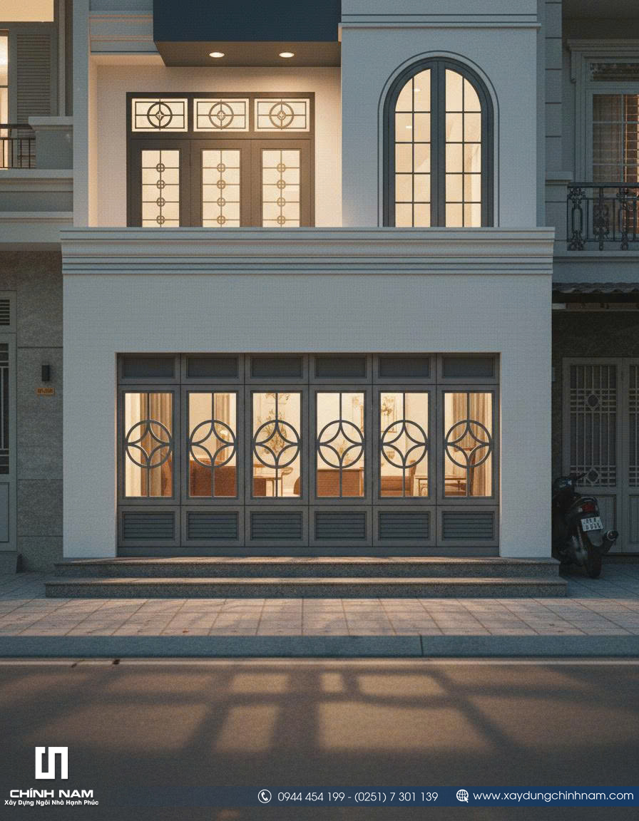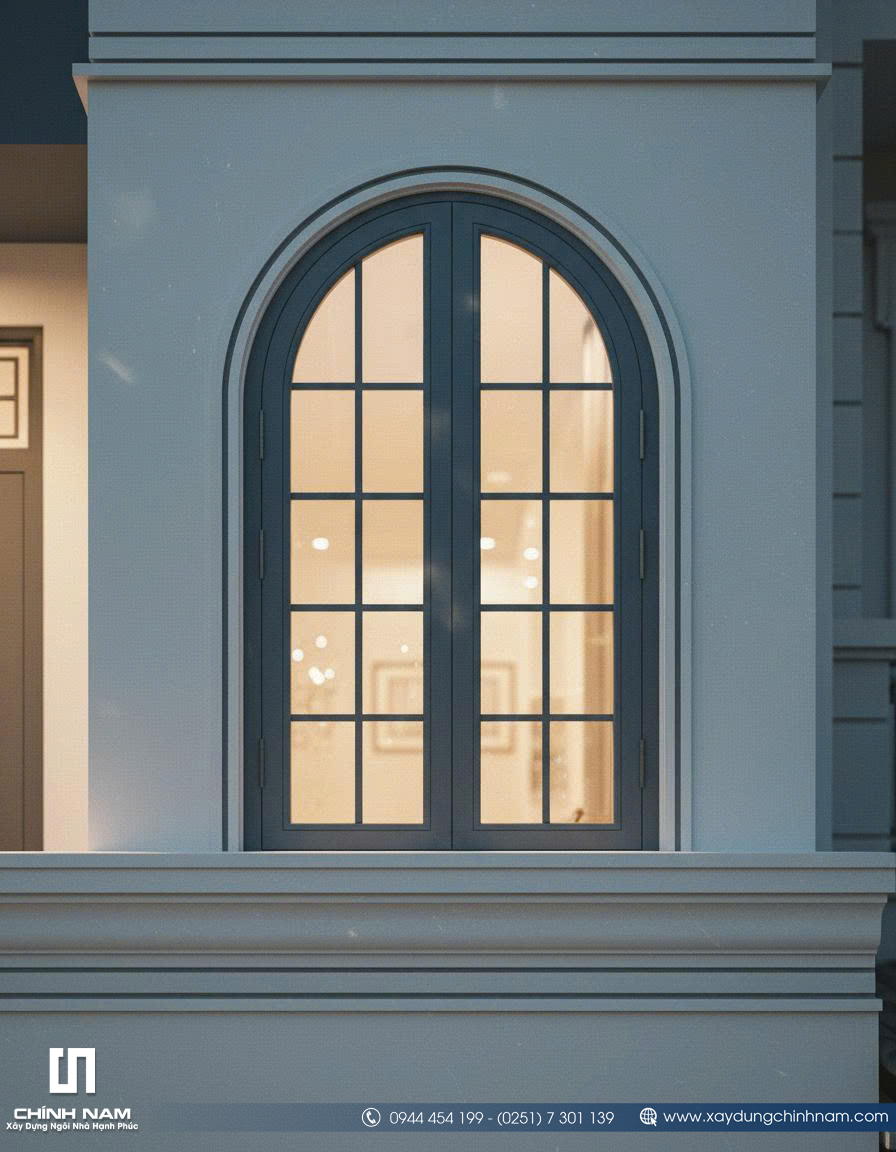 Ấn tượng đầu tiên của công trình đến từ mặt tiền được tổ chức mạch lạc, tỷ lệ hình khối cân xứng và cách phối hợp vật liệu đầy tinh tế. Những đường phào chỉ nhẹ nhàng, hệ cột giả được xử lý gọn gàng, khung cửa vòm mềm mại cùng lan can sắt mỹ thuật thanh thoát đã góp phần tạo nên diện mạo sang trọng cho ngôi nhà. Gam màu trắng kem kết hợp xanh ghi trầm không chỉ tôn lên vẻ đẹp thanh lịch mà còn giúp tổng thể kiến trúc trở nên nổi bật, hiện đại và có chiều sâu hơn giữa dãy phố.