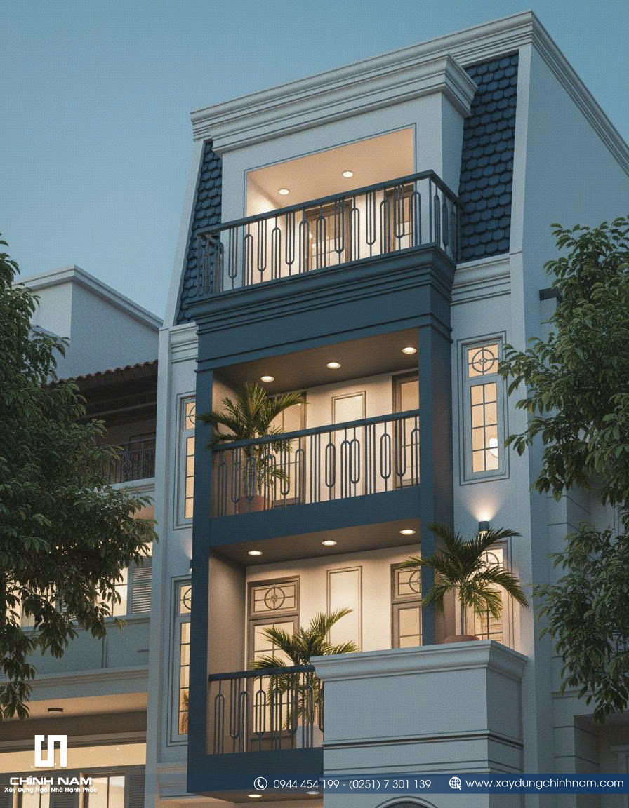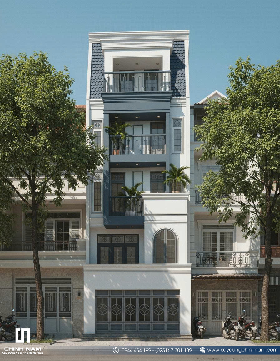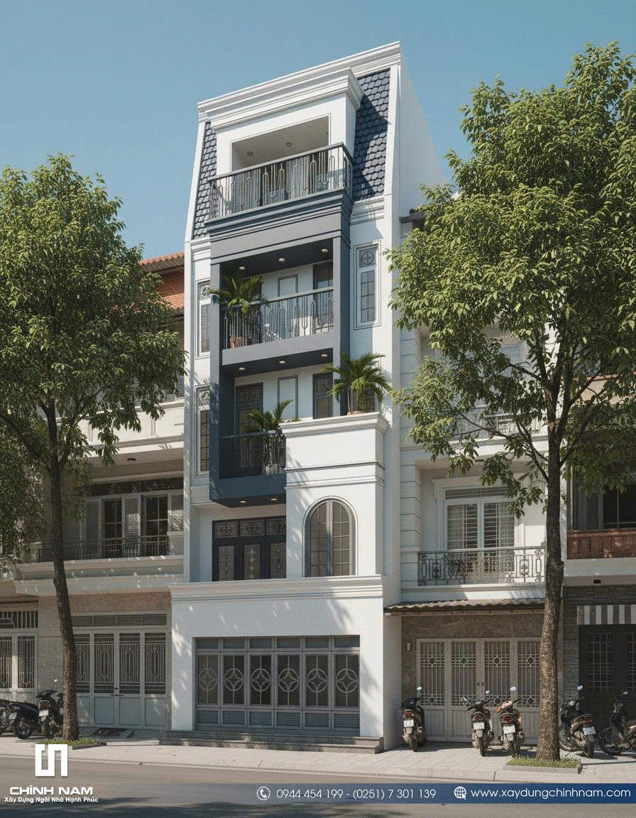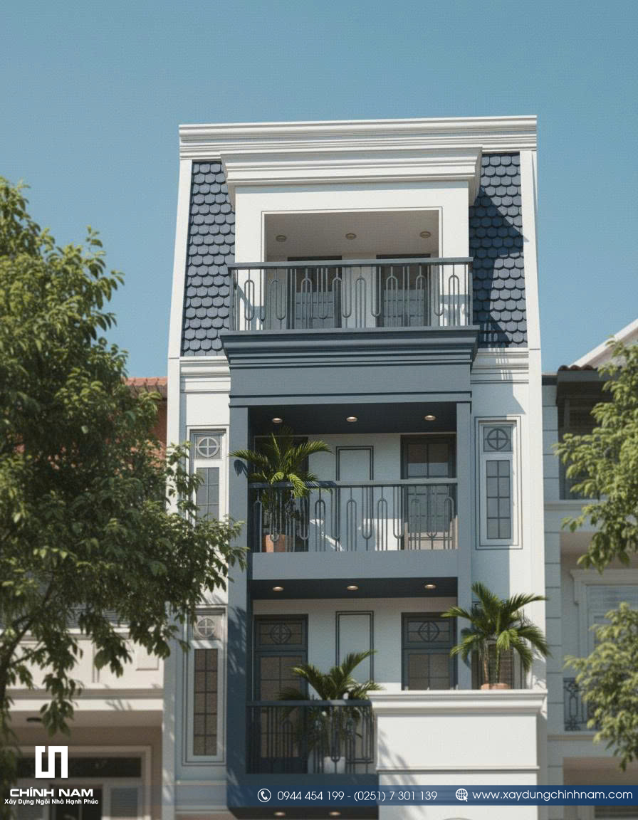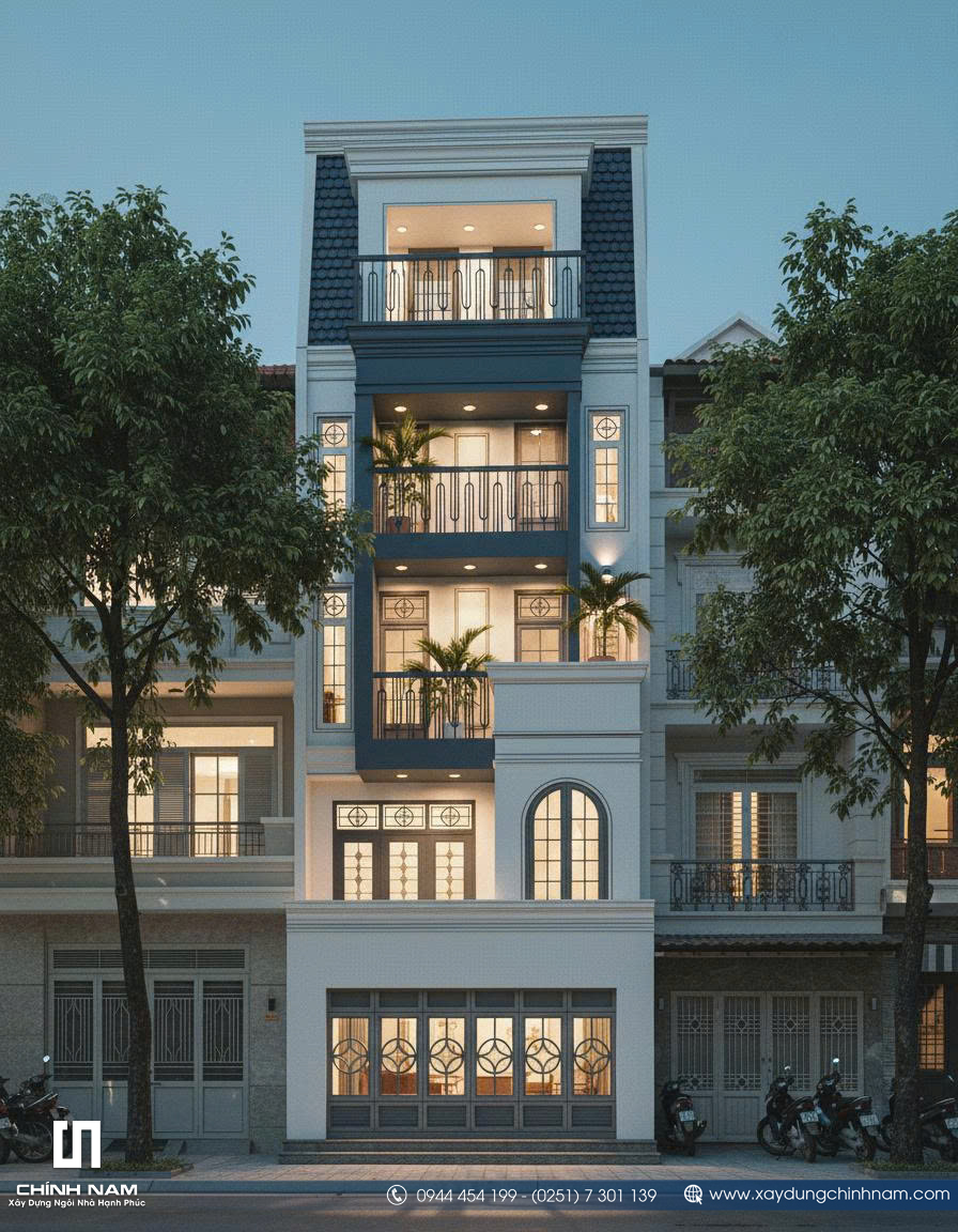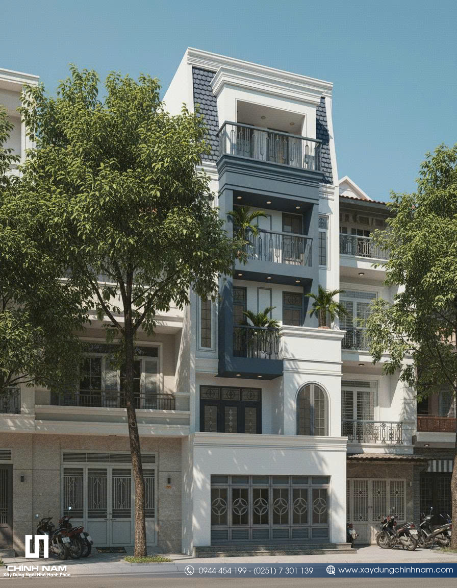 Ấn tượng đầu tiên của công trình đến từ mặt tiền được tổ chức mạch lạc, tỷ lệ hình khối cân xứng và cách phối hợp vật liệu đầy tinh tế. Những đường phào chỉ nhẹ nhàng, hệ cột giả được xử lý gọn gàng, khung cửa vòm mềm mại cùng lan can sắt mỹ thuật thanh thoát đã góp phần tạo nên diện mạo sang trọng cho ngôi nhà. Gam màu trắng kem kết hợp xanh ghi trầm không chỉ tôn lên vẻ đẹp thanh lịch mà còn giúp tổng thể kiến trúc trở nên nổi bật, hiện đại và có chiều sâu hơn giữa dãy phố.