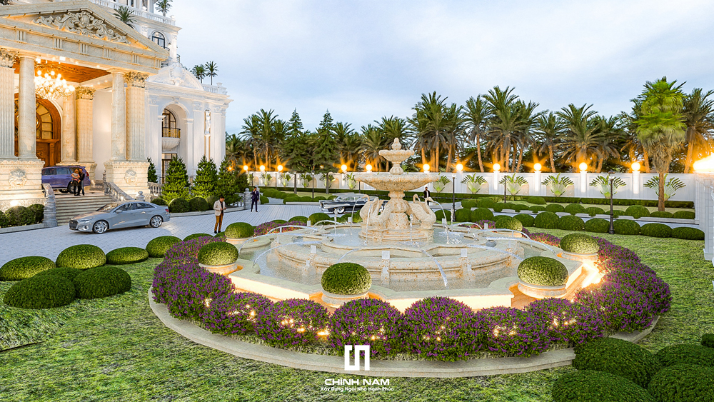 Ở dự án, cổng chính sử dụng cánh kim loại trang trí họa tiết hoàng gia, tông vàng đồng, đặt trên trụ cổng và tường rào ốp đá sáng. Chiều cao và tỉ lệ cổng tương xứng với quy mô dinh thự, tạo cảm giác uy nghi ngay từ mặt tiền. Hàng rào được chia nhịp bằng trụ lớn, xen giữa là song kim loại hoặc mảng thoáng, phía trên gắn đèn trang trí. Cách bố trí này vừa đảm bảo an ninh, vừa giữ được tầm nhìn để từ bên ngoài vẫn cảm nhận được vẻ đẹp của công trình. Trước sảnh chính, đài phun nước được đặt đúng trục, bao quanh là bồn cây tạo điểm dừng thị giác đẹp và mang ý nghĩa phong thủy cát tường. Mảng xanh được bố trí đa lớp với cây tùng, cây bụi tròn, hoa bụi thấp, hàng cọ và cây lớn phía sau. Cây xanh ôm lấy công trình nhưng vẫn chừa đủ khoảng trống để tôn vinh mặt đứng. Đây là kiểu tổ chức cảnh quan thường thấy ở các biệt thự lâu đài châu Âu cao cấp: vừa như một “công viên riêng”, vừa là không gian tổ chức tiệc, đón khách.